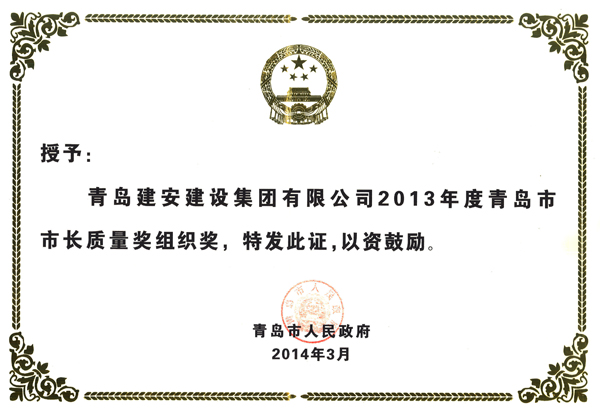 市长质量奖证书